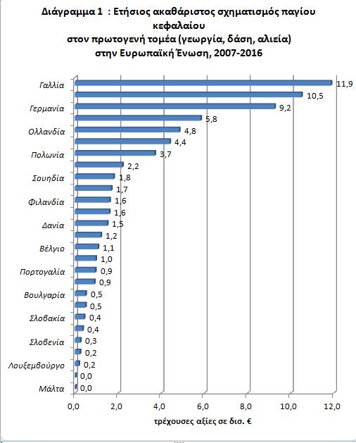 Στον πρωτογενή τομέα της οικονομίας (γεωργία, αλιεία, δάση) κατά την περίοδο 2007-2016 οι μεγαλύτερες χώρες στην Ευρωπαϊκή Ένωση εμφανίζουν τον μεγαλύτερο ακαθάριστο σχηματισμό παγίου κεφαλαίου και τις περισσότερες επενδύσεις σε απόλυτα μεγέθη. Η χώρα μας βρίσκεται στη 12η θέση της κατάταξης με 1,6 περίπου δισ. € κατά μέσο όρο ετησίως ακαθάριστο σχηματισμό παγίου κεφαλαίου για την εξεταζόμενη περίοδο 2007-2016 (διάγραμμα 1).