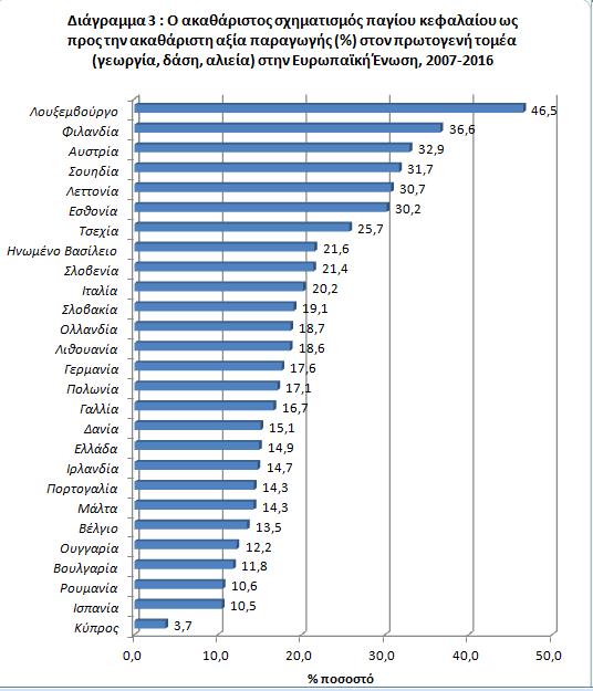 Από την μελέτη του δείκτη κατά την εξεταζόμενη περίοδο 2007-2016 σε ευρωπαϊκό επίπεδο φαίνεται ότι οι χώρες με το μεγαλύτερο σχηματισμό παγίου κεφαλαίου σε σχέση με την Ακαθάριστη Αξία Παραγωγής στη γεωργία κατά μέσο όρο ετησίως είναι το Λουξεμβούργο (46,5%), η Φιλανδία (36,6%) και η Αυστρία (32,9%). Οι χώρες με το μικρότερο ποσοστό σχηματισμού παγίου κεφαλαίου σε σχέση με την Ακαθάριστη Αξία Παραγωγής στη γεωργία κατά μέσο όρο ετησίως είναι η Κύπρος (3,7%), η Ισπανία (10,5%) και η Ρουμανία (10,6%). Ο εν λόγω δείκτης για την Ελλάδα είναι 14,9% για την περίοδο 2007-2016, δηλαδή οι ετήσιες κατά μέσο όρο επενδύσεις παγίου κεφαλαίου στον πρωτογενή τομέα της οικονομίας αποτελούν το 14,9% της ακαθάριστης αξίας γεωργικής παραγωγής (διάγραμμα 3).