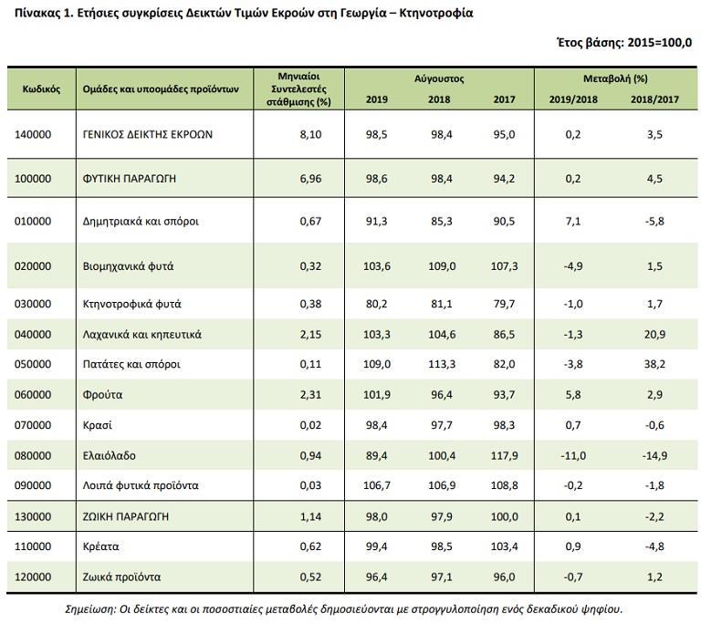 Ο Γενικός Δείκτης Τιμών Εκροών στη Γεωργία – Κτηνοτροφία για τον Αύγουστο του 2019 σε σύγκριση με τον ίδιο μήνα της προηγούμενης χρονιάς παρουσίασε αύξηση 0,2%, έναντι αύξησης 3,5% που παρουσίαζε τον Αύγουστο του 2018 έναντι του Αυγούστου του 2017. Η αύξηση του Δείκτη Τιμών Εκροών κατά 0,2%, τον μήνα Αύγουστο 2019, σε σύγκριση με τον αντίστοιχο δείκτη του Αυγούστου 2018, οφείλεται: στην αύξηση κατά 0,2% του δείκτη τιμών της φυτικής παραγωγής και κυρίως στις μεταβολές των ομάδων: φρούτα, δημητριακά και σπόρο στην αύξηση κατά 0,1% του δείκτη τιμών ζωικής παραγωγής και κυρίως στη μεταβολή της ομάδας: κρέατα. Η μείωση του Γενικού Δείκτη Τιμών Εισροών κατά 1,0%, τον μήνα Αύγουστο 2019, σε σύγκριση με τον αντίστοιχο δείκτη του Αυγούστου 2018, οφείλεται: στην μείωση κατά 1,3% του δείκτη τιμών των αναλώσιμων μέσων και κυρίως στις μεταβολές των ομάδων: λοιπά αγαθά και υπηρεσίες, ενέργεια και λιπαντικά, ζωοτροφές.