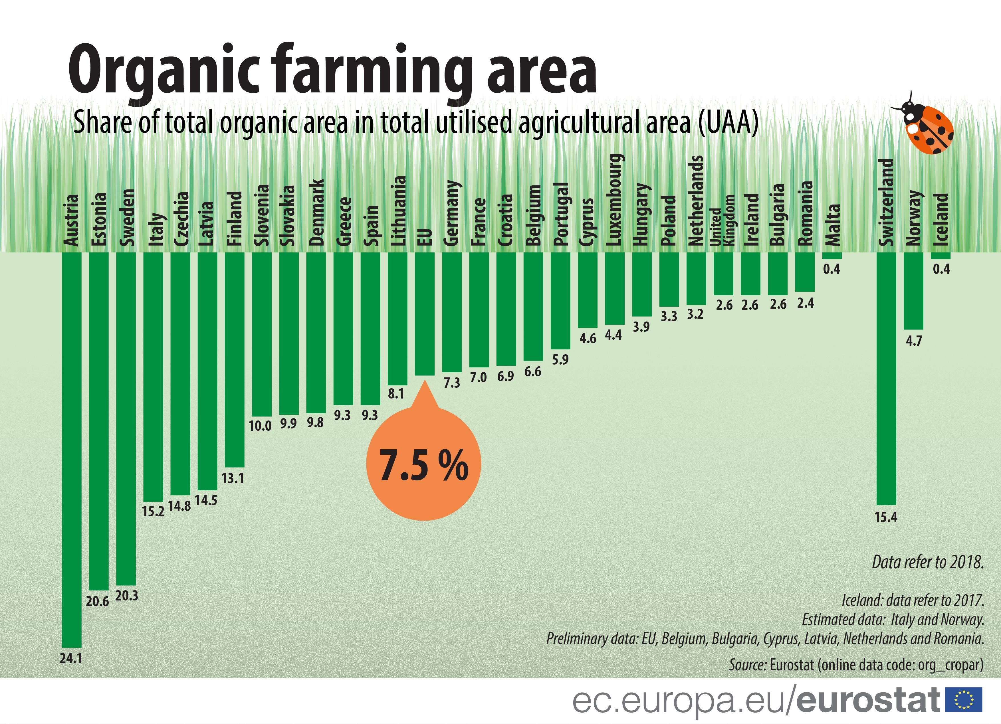 Η Ελλάδα ενώ βρίσκεται στις τρεις χαμηλότερες θέσεις με μόλις 1,8%, θα σημειωθεί αύξηση και θα φθάσει το 13,6%. Παρατηρώντας το ποσοστό της βιολογικής καλλιέργειας (9,3%) για το 2018 αναμένουμε ότι οι εκτιμήσεις της EUROSTAT θα βγουν αληθινές σημειώνοντας μια μεγάλη νίκη για την ελληνική γεωργία και την υιοθέτηση της νέας ΚΑΠ. Όμως, αξίζει να σημειωθεί ότι χρειάζεται περαιτέρω ανάλυση για να καταλήξουμε στο γενικό συμπέρασμα και να απαντήσουμε με ειλικρίνεια αν οι μεταρρυθμίσεις έπαιξαν βασικό ρόλο στη συμμόρφωση των γεωργικών πρακτικών και στην εξέλιξη της βιολογικής γεωργίας.