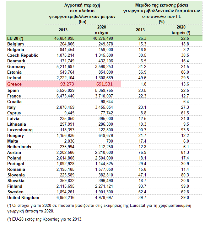 Το 2013 λοιπόν, σύμφωνα με την έρευνα της EUROSTAT, η γεωργική έκταση ακολουθώντας τις γεωργικές-περιβαλλοντικές δεσμεύσεις στην ΕΕ ανήλθε σε 47 εκατομμύρια εκτάρια, αντιπροσωπεύοντας το 26% της χρησιμοποιούμενης γεωργικής έκτασης της ΕΕ. Το ποσοστό που αναμένεται στη διάρκεια της περιόδου 2014-2020 εκτιμάται ότι θα αγγίξει το 22,5% με μια μείωση της τάξης των 3,5% που προβλέπεται αναπόφευκτη αφού στη Γερμανία και Ολλανδία παρατηρούμε μεγάλη μείωση μελλοντικά.
