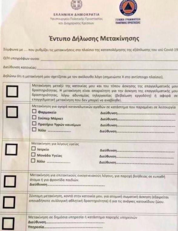 Για την κίνησή του ο πολίτης θα έχει δυο τύπους εγγράφου. Ο τύπος «Α» και πρόκειται για κίνηση προς την εργασία και ο τύπος «Β» που πρόκειται για όλες τις άλλες περιπτώσεις».