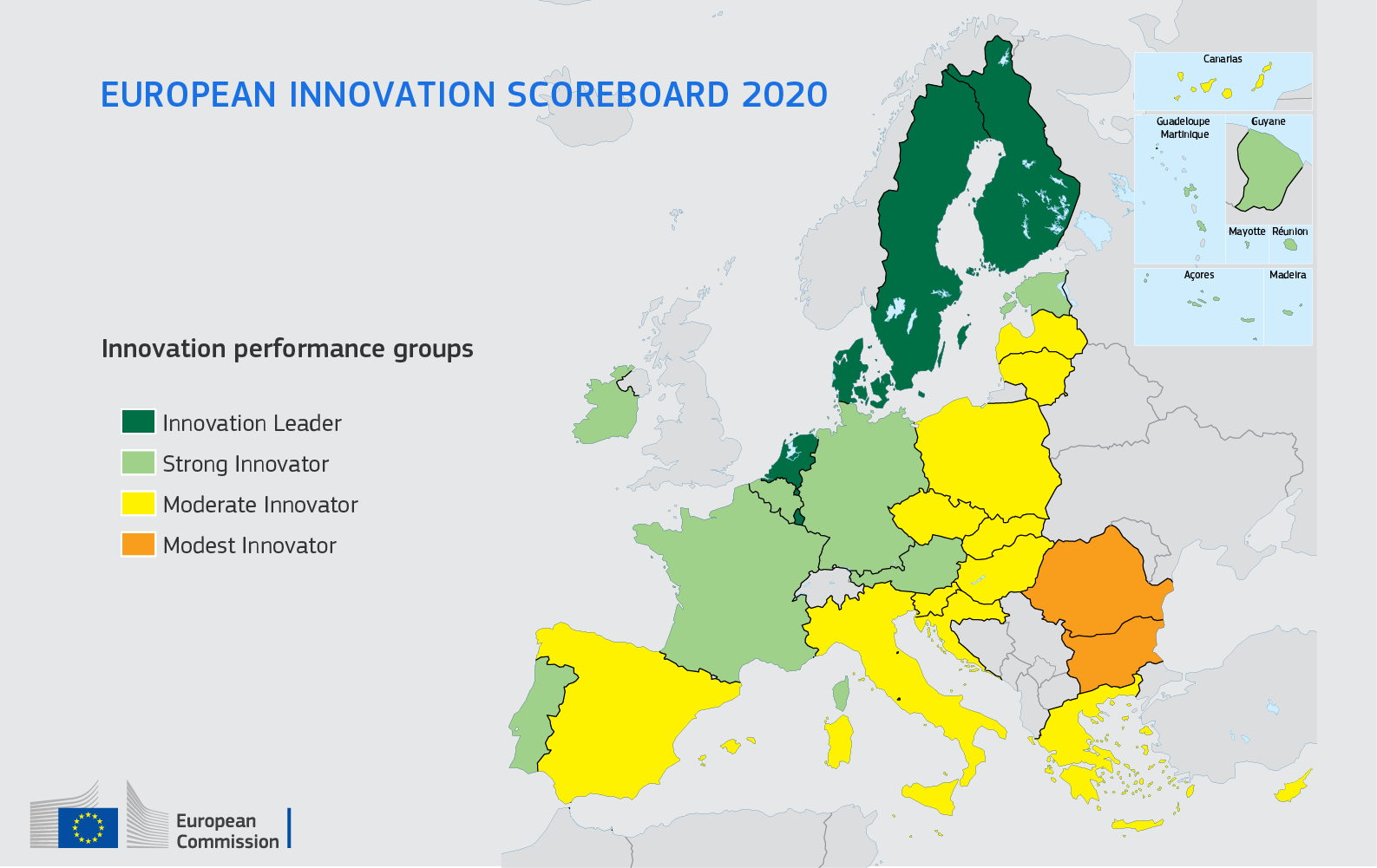 Στην κορυφή του Πίνακα Καινοτομίας 2020 βρέθηκε ξανά η Σουηδία, ακολουθούμενη κατά σειρά από τη Φινλανδία, τη Δανία και την Ολλανδία, κάτι που δείχνει ότι ο σκανδιναβικός Βορράς έχει σταθερά ηγετική θέση στις καινοτομίες. Προηγούνται οι «Ηγέτες Καινοτομίας» (Σουηδία, Δανία, Φινλανδία, Ολλανδία, Λουξεμβούργο) που καινοτομούν πολύ πάνω από το μέσο ευρωπαϊκό όρο και ακολουθεί η δεύτερη ομάδα χωρών «(Ισχυροί καινοτόμοι») που βρίσκονται λίγο πάνω από το μέσο όρο (Αυστρία, Βέλγιο, Γαλλία, Γερμανία, Εσθονία, Ιρλανδία, Πορτογαλία).