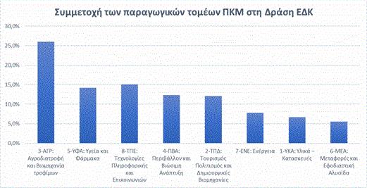 Σε αντιστοιχία με τον αριθμό συμμετοχών, ο τομέας – πρωταθλητής της Αγροδιατροφής βρίσκεται αυτήν την περίοδο στην υλοποίηση του 22% του συνόλου των εγκεκριμένων προτάσεων της Δράσης ΕΔΚ στην Περιφέρεια Κεντρικής Μακεδονίας και ακολουθεί ο τομέας των Τεχνολογιών Πληροφορικής και Επικοινωνιών (ΤΠΕ) στην υλοποίηση του 19% των ερευνητικών έργων.
