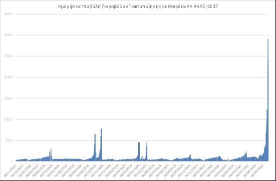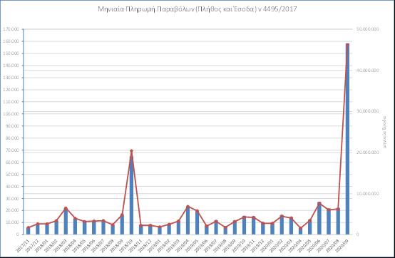 - Η ημερήσια καταβολή παραβόλων εκτινάχθηκε τον Σεπτέμβριου του 2020 στα 28.000 περίπου, όταν η μέγιστη κορύφωση στο παρελθόν ήταν την περίοδο Οκτωβρίου - Νοεμβρίου 2018 με 8.500 παράβολα.