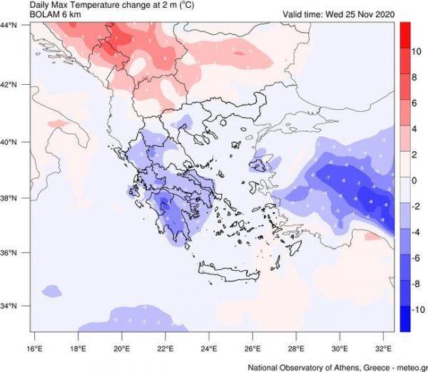 Σύμφωνα με τον προγνωστικό χάρτη που ακολουθεί αποτυπώνεται η εκτιμώμενη μεταβολή (πτώση) των μεγίστων θερμοκρασιών σήμερα σε σχέση με τις αντίστοιχες της Τρίτης 24/11, η οποία θα είναι της τάξης των 3-6 βαθμών.