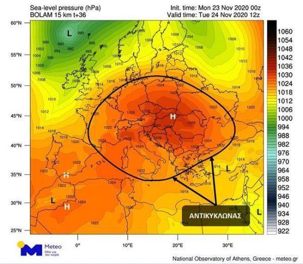 Ο εκτεταμένος ισχυρός αντικυκλώνας που εμφανίζεται στον παρακάτω χάρτη θα φέρει ήπιο καιρό με ομίχλες στη χώρα μας.