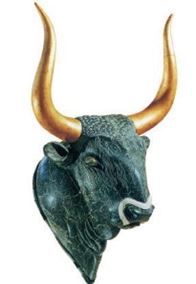 Εικ. 14 Τελετουργικό σκεύος λίθινου ρυτού σε σχήμα κεφαλής ταύρου. Αριστουργήματα της μινωικής τέχνης, τεχνουργημένο με ιδιαίτερη ακρίβεια στην απόδοση των φυσικών χαρακτηριστικών τα οποία παραπέμπουν σε ταύρο της φυλής Κατερίνης.