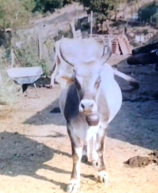Εικ. 6 Αγελάδα φυλής Κατερίνης με το λευκό κύκλος γύρω από το ρύγχος καθώς και τα κέρατα σε σχήμα λύρας χαρακτηριστικά σημάδια πρωτόγονης φυλής.