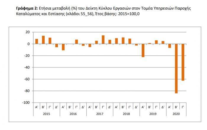 Τα στοιχεία που δημοσιοποίησε και επίσημα η Ελληνική Στατιστική Αρχή την Τετάρτη δείχνουν ότι στο σύνολο εστίασης και παροχής καταλύματος, δύο κρίσιμους τομείς για την τουριστική βιομηχανία, η ελληνική οικονομία έχασε το γ΄ τρίμηνο το 62,6% του τζίρου των δύο κεντρικών κλάδων του ελληνικού τουρισμού.