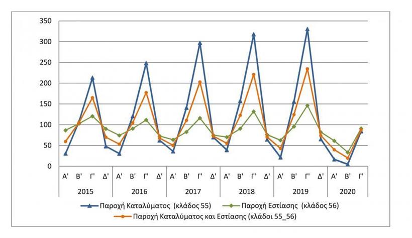 Οι σχετικοί δείκτες υποχώρησαν σε σχέση με το ίδιο διάστημα του 2019 κατά 74,5% στην παροχή καταλυμάτων και κατά 37,9% στην εστίαση. Η εξάρτηση του τουρισμού σε ετήσια βάση από τα δύο «θερινά» τρίμηνα, οπότε ο τζίρος είναι πολλαπλάσιος των δύο «χειμερινών», γίνεται σαφής όταν απεικονίζεται σε γράφημα, όπως αυτό που συνοδεύει την ανακοίνωση της ΕΛΣΤΑΤ.