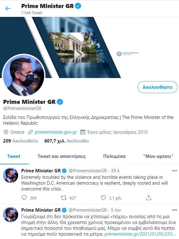 Με ένα tweet από τον πρωθυπουργικό λογαριασμό ο πρωθυπουργός Κυριάκος Μητσοτάκης εξέφρασε την ανησυχία του με τα όσα διαδραματίζονται στην άλλη άκρη του Ατλαντικού. Ο πρωθυπουργός σχολίασε χαρακτηριστικά: «Είμαι εξαιρετικά ταραγμένος από τη βία και τα τραγικά γεγονότα που λαμβάνουν χώρα στην Ουάσιγκτον. Η αμερικανική δημοκρατία έειι βαθιές ρίζες και θα ξεπεράσει αυτή την κρίση».