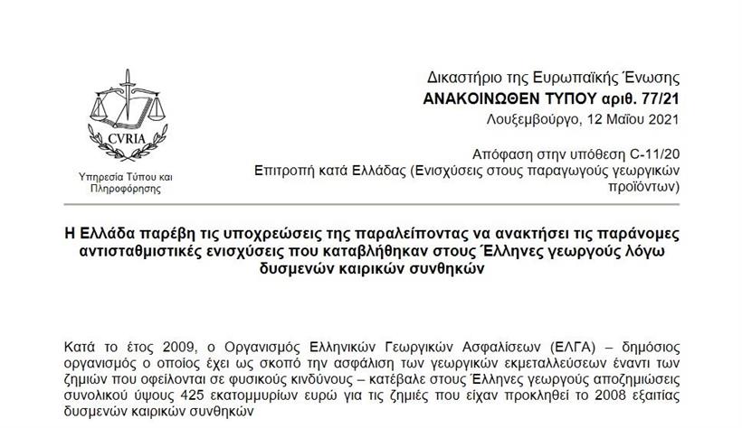 Τελικά, την Τετάρτη 11 Μαΐου το Ευρωπαϊκό Δικαστήριο δέχτηκε την προσφυγή λόγω παραβάσεως κράτους μέλους που άσκησε η Επιτροπή και αποφάσισε ότι η Ελλάδα παρέβη τις υποχρεώσεις της παραλείποντας να ανακτήσει τις παράνομες αντισταθμιστικές ενισχύσεις που καταβλήθηκαν στους Έλληνες γεωργούς λόγω δυσμενών καιρικών συνθηκών.