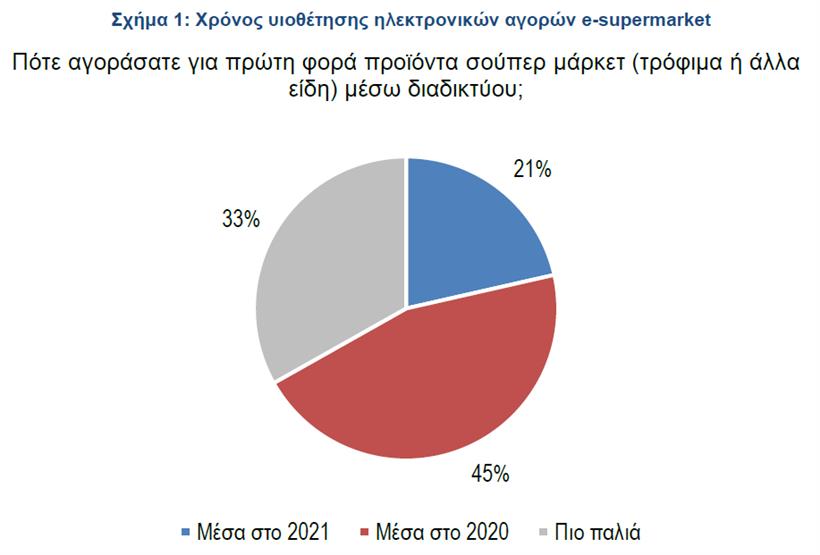 Όπως καταγράφεται στο σχήμα 1, η πλειοψηφία των αγοραστών από ηλεκτρονικά σουπερμάρκετ πραγματοποίησε την πρώτη του αγορά την περίοδο της πανδημίας. Συγκεκριμένα το 45% το 2020 και το 21% το 2021. Μόνο 1 στους 3 αγοραστές, 33%, είχε αγοράσει νωρίτερα προϊόντα σουπερμάρκετ μέσω διαδικτύου.