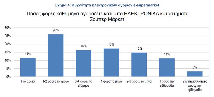 Η συχνότητα ηλεκτρονικών αγορών παραμένει μεν χαμηλότερη, αλλά με σημαντικά υψηλή δαπάνη ανά αγορά. Ο μέσος αγοραστής e-supermarket πραγματοποιεί κατά μέσο όρο 16 αγορές τον χρόνο. Όπως φαίνεται και στο σχήμα 4, 1 στους 2 αγοραστές ηλεκτρονικών σουπερμάρκετ, το 46% αγοράζει τουλάχιστον μία φορά τον μήνα. Βέβαια το 37% αγοράζει λίγες φορές μέσα στον χρόνο και αποτελούν ένα κοινό το οποίο καλούνται οι επιχειρήσεις του κλάδου να προσεγγίσουν, ώστε να αποκτήσουν μεγαλύτερη συχνότητα.