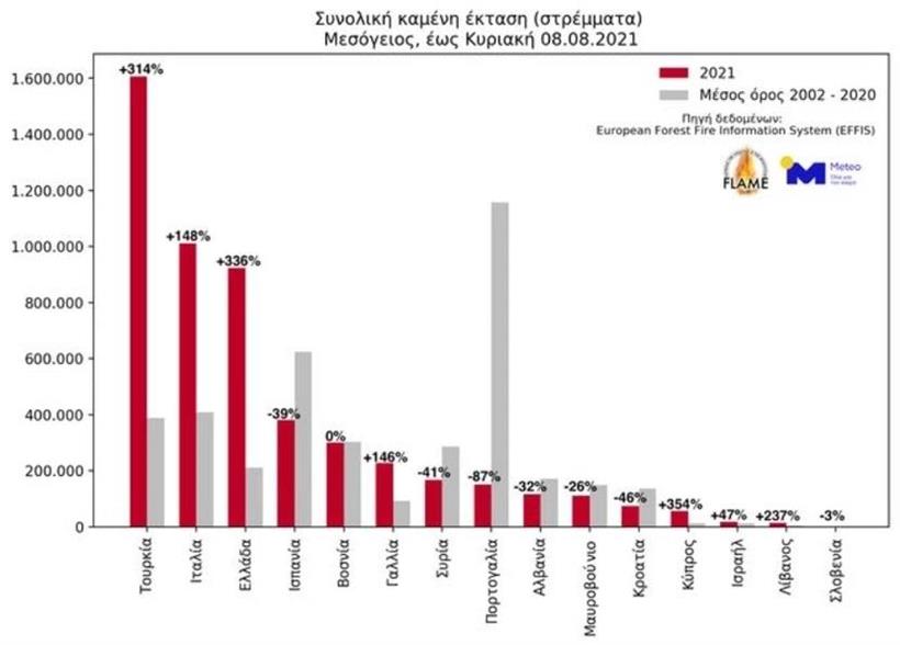 Η Ιταλία είναι η «πρωταθλήτρια» φέτος, με περίπου 1,6 εκατομμύρια στρέμματα (αύξηση 314% έναντι του μέσου όρου 2002-2020) και ακολουθεί η Τουρκία με περίπου ένα εκατομμύριο στρέμματα και αύξηση 148%. Μετά την τρίτη Ελλάδα, ακολουθεί η Ισπανία με καμένες εκτάσεις σχεδόν 400.000 στρεμμάτων (μείωση 39%).