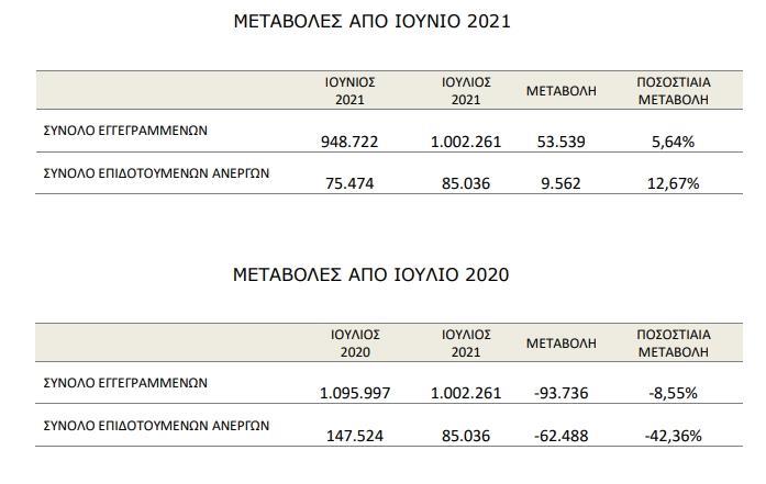 Το σύνολο των εγγεγραμμένων ανέργων, με κριτήριο την αναζήτηση εργασίας (αναζητούντων εργασία), για τον μήνα Ιούλιο 2021, ανήλθε σε 972.981 άτομα. Από αυτά 567.244 (ποσοστό 58,30%) είναι εγγεγραμμένα στο μητρώο του ΟΑΕΔ για χρονικό διάστημα ίσο ή και περισσότερο των 12 μηνών και 405.737 (ποσοστό 41,70%) είναι εγγεγραμμένα στο μητρώο του ΟΑΕΔ για χρονικό διάστημα μικρότερο των 12 μηνών. Οι άνδρες ανέρχονται σε 323.321 (ποσοστό 33,23%) και οι γυναίκες ανέρχονται σε 649.660 (ποσοστό 66,77%).