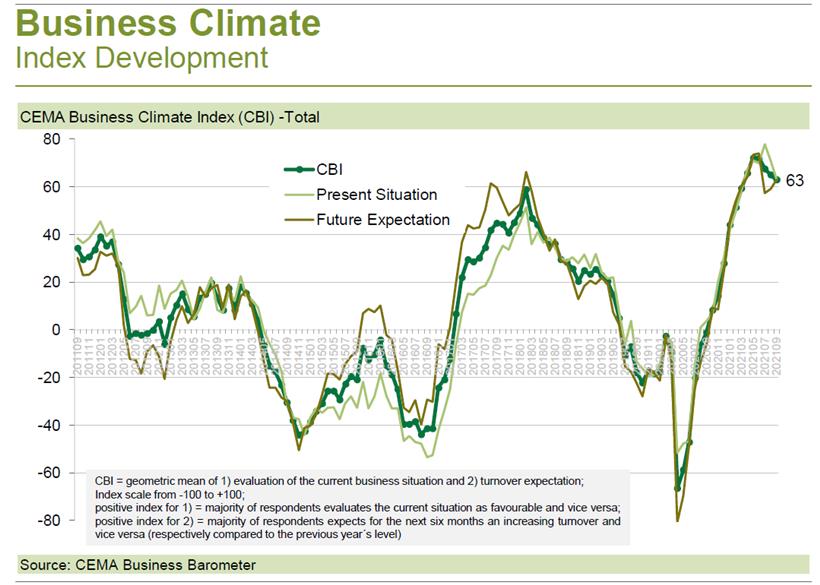 Ο γενικός δείκτης επιχειρηματικού κλίματος για τη βιομηχανία γεωργικών μηχανημάτων στην Ευρώπη φαίνεται να έχει φτάσει στο αποκορύφωμά του τους μήνες Μάιο και Ιούνιο (με τα υψηλότερα επίπεδα από το 2008). Τον Σεπτέμβριο, ο δείκτης μειώθηκε ελαφρώς για τρίτο συνεχόμενο μήνα σε υψηλό επίπεδο (σε 63 μονάδες σε κλίμακα -100 έως +100). Η πτώση αυτή τη φορά είναι το αποτέλεσμα ορισμένων εταιρειών να αξιολογήσουν τις τρέχουσες δραστηριότητές τους ελαφρώς λιγότερο ευνοϊκά.