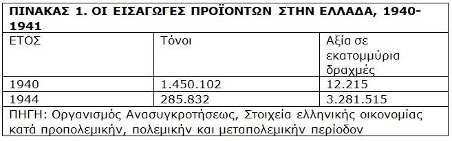 Κατά τη διάρκεια της Κατοχής οι εισαγωγές προϊόντων έχουν μειωθεί αισθητά (πίνακας 1).