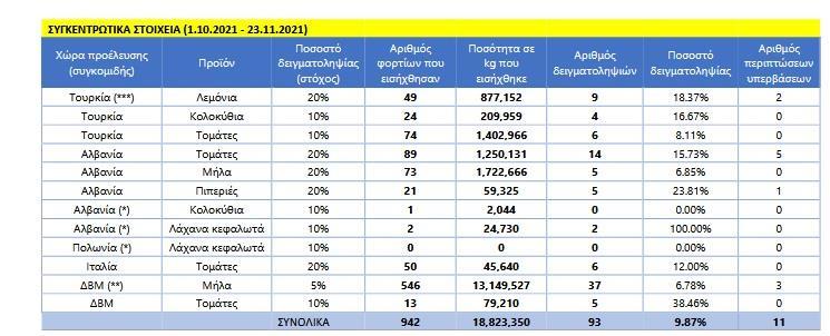 2. Παρατηρείται αθρόα εισαγωγή μήλων προέλευσης Δημοκρατίας της Βόρειας Μακεδονίας (546 φορτία και περισσότερα από 13 εκατομμύρια κιλά) κυρίως για χυμοποίηση αλλά και για την χονδρική αγορά και σε συγκεκριμένες περιπτώσεις και από Αγροτικούς Συνεταιρισμούς. Διαπιστώθηκαν αυξημένες υπερβάσεις υπολειμμάτων και συγκεκριμένα σε ποσοστό 8,11% (3 δείγματα με υπερβάσεις στα 37 δείγματα που λήφθηκαν).