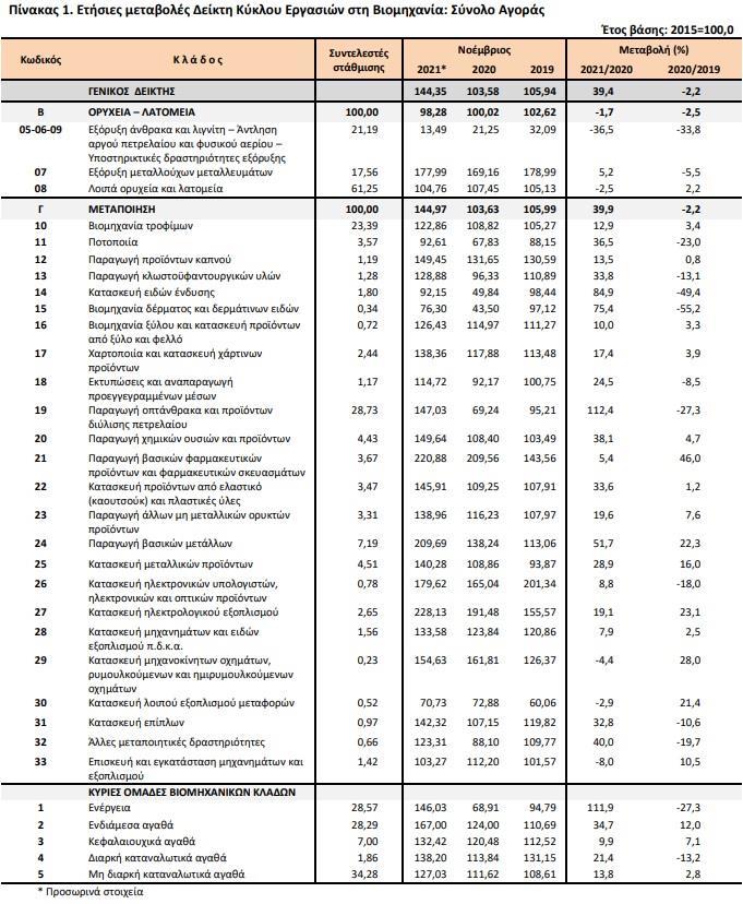 - Ο γενικός δείκτης κύκλου εργασιών, σε σύγκριση με τον αντίστοιχο δείκτη του Νοεμβρίου του 2020, παρουσίασε αύξηση 39,4%.