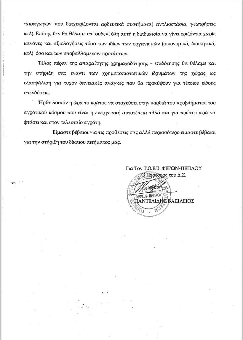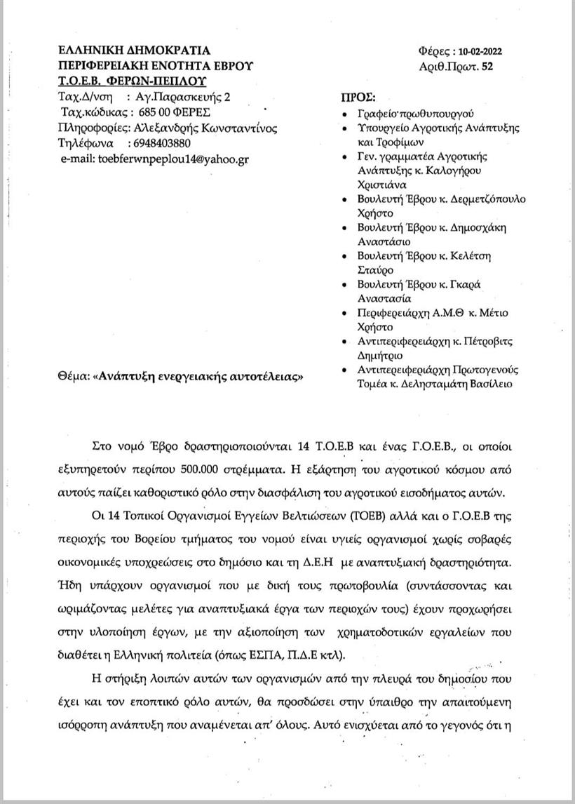 Με επιστολή του το ΤΟΕΒ Φερών – Πέπλου προς τον πρωθυπουργό, το Υπουργείο Αγροτικής Ανάπτυξης και Τροφίμων, τους βουλευτές Έβρου καθώς και προς την διοίκηση της Περιφέρειας Ανατολική Μακεδονίας και Θράκης, καταθέτει την πρότασή του για την ανάπτυξη ενεργειακής αυτοτέλειας και τη μείωση του κόστους που επωμίζονται οι αγρότες της περιοχής.