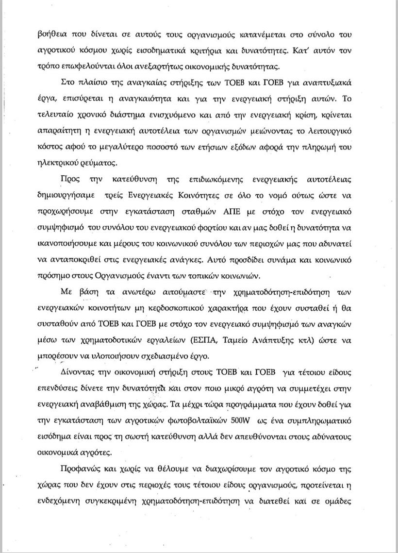 Με βάση τα ανωτέρω αιτούμαστε την χρηματοδότηση-επιδότηση των ενεργειακών κοινοτήτων μη κερδοσκοπικού χαρακτήρα που έχουν συσταθεί ή θα συσταθούν από ΤΟΕΒ και ΓΟΕΒ με στόχο τον ενεργειακό συμψηφισμό των αναγκών μέσω των χρηματοδοτικών εργαλείων (ΕΣΠΑ, Ταμείο Ανάπτυξης κτλ) ώστε να μπορέσουν να υλοποιήσουν σχεδιασμένο έργο.