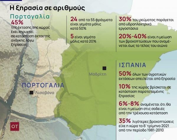 Περίπου το 50% όλων των αγροτικών εκτάσεων της Ισπανίας θεωρείται ότι απειλείται άμεσα από την ξηρασία. Ειδικότερα, κινδυνεύουν μεταξύ άλλων σοδειές σε δημητριακά, ελιές, αλλά και αμπελώνες. Οι νέες προβλέψεις κάνουν λόγο για μείωση στις σοδειές αυτές της τάξης του 6% με 8%, όπως προειδοποίησαν αγροτικές οργανώσεις σύμφωνα με το ΑΡ. Είναι ενδεικτικό ότι δορυφορικές εικόνες δείχνουν τη συγκέντρωση γλυκού νερού στη μεγαλύτερη δεξαμενή της χώρας, στην Almendra στην Castilla y Leon, να έχει υποχωρήσει μόλις στο ένα τρίτο της χωρητικότητάς της. Το 2022 είναι πλέον, σύμφωνα με την κρατική υπηρεσία μετεωρολογίας και κλιματολογίας της Ισπανίας, το δεύτερο πιο «στεγνό» έτος του 21ου αιώνα.