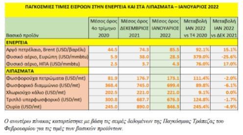Σε σύγκριση με το τελευταίο τρίμηνο του 2020, όταν οι τιμές του πετρελαίου ήταν μάλλον χαμηλές, το κόστος του αργού πετρελαίου ήταν κατά περισσότερο από 90% υψηλότερο και, κυρίως, σημειώθηκε περαιτέρω αύξηση κατά περίπου 15% σε σύγκριση με τον Δεκέμβριο του 2021, φθάνοντας σε επίπεδα που δεν έχουν εμφανισθεί από το 2014. Το κόστος του φυσικού αερίου συνέχισε επίσης, να είναι πολύ υψηλό στις αρχές του 2022.