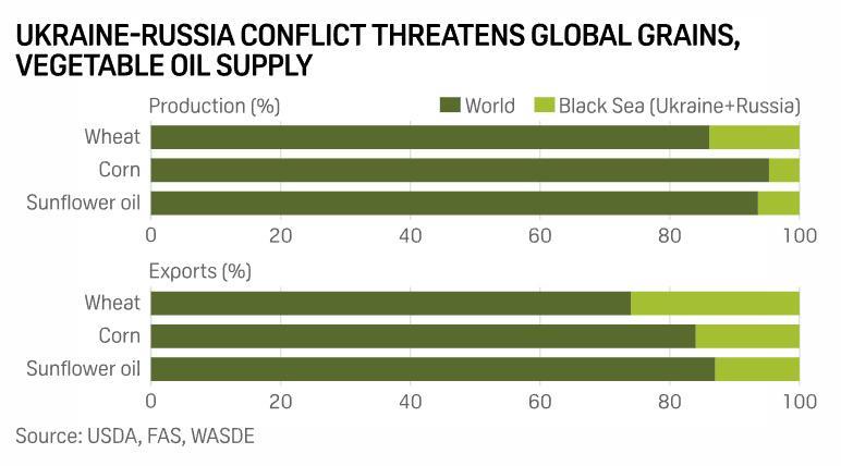 «Οι εξαγωγές μειώνονται για την Ουκρανία κατά 4,0 εκατομμύρια τόνους σε 20,0 εκατομμύρια, καθώς η σύγκρουση στη χώρα αυτή αναμένεται να διαταράξει τις εξαγωγές από την περιοχή της Μαύρης Θάλασσας», ανέφερε η μηνιαία έκθεση WASDE του USDA.