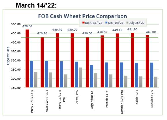 Το HRS των ΗΠΑ για τον Απρίλιο του 2022 αποτιμάται στα 470,00 $/mt FOB PNW (αύξηση 12 $/mt από την περασμένη εβδομάδα και 45 $/mt από τις 14 Φεβρουαρίου), το FOB Gulf HRW 11/12,5 pro αποτιμάται στα 479,60 $/mt ( μείωση 29,60 $/ mt από την περασμένη εβδομάδα, με άνοδο 24,90 $/mt από τις 24 Φεβρουαρίου ).