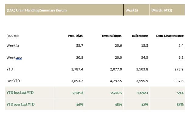 Οι εξαγωγές Σκληρού σιταριού (Durum) για την εβδομάδα 31 ήταν μικροσκοπικά 14.000 mt, για ένα σύνολο 1,5 εκατομμυρίων mt από τις αρχές του έτους μέχρι σήμερα, σε σύγκριση με 3,6 εκατομμύρια τόνους πέρυσι μέχρι σήμερα. Αυτό είναι τώρα μόλις το 42% του περυσινού ρυθμού.
