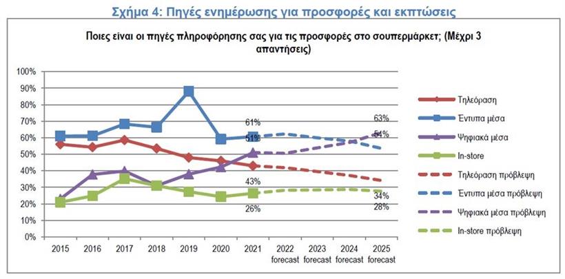 Σε σχέση με τις πηγές πληροφόρησης για τις προσφορές και τις εκπτώσεις, όπως φαίνεται και στο σχήμα 4, τα κύρια κανάλια είναι τα έντυπα μέσα με 61% (κυρίως τα ενημερωτικά φυλλάδια με 56%), η τηλεόραση με 43% και τα ψηφιακά μέσα με 51% (αθροιστικά internet, κινητό τηλέφωνο, ηλεκτρονικά σουπερμάρκετ). Διαχρονικά φαίνεται ότι τα πρώτα δύο κανάλια (φυλλάδια και τηλεόραση) παρουσιάζουν μικρή κάμψη, ενώ κερδίζουν έδαφος οι νέες τεχνολογίες αθροιστικά να αυξάνονται από 22% σε 51%. Οι λοιπές πηγές ενημέρωσης παρουσιάζουν επίσης διακυμάνσεις με τις σημαντικότερες να είναι η μείωση τα τελευταία χρόνια για την ενημέρωση εντός του καταστήματος (π.χ. αφίσες). Η προβολή των τάσεων στο μέλλον δείχνει ότι τα ψηφιακά μέσα μέσα στην επόμενη πενταετία να γίνεται το κύριο κανάλι ενημέρωσης με 63%, το φυλλάδιο να βρίσκεται στη δεύτερη θέση με 54% και η τηλεόραση να πέφτει στο 34%. Η αύξηση της αξιοποίησης των ψηφιακών τεχνολογιών είναι ιδιαίτερα σημαντική τη συγκεκριμένη χρονική περίοδο, καθώς δίνει στον καταναλωτή τα απαραίτητα εργαλεία για τη μέγιστη αξιοποίηση των προσφορών και εκπτώσεων για την εξοικονόμηση δαπάνης, ενώ αποτελεί και μία διαφανή διαδικασία σύγκρισης τιμών από τον καταναλωτή.