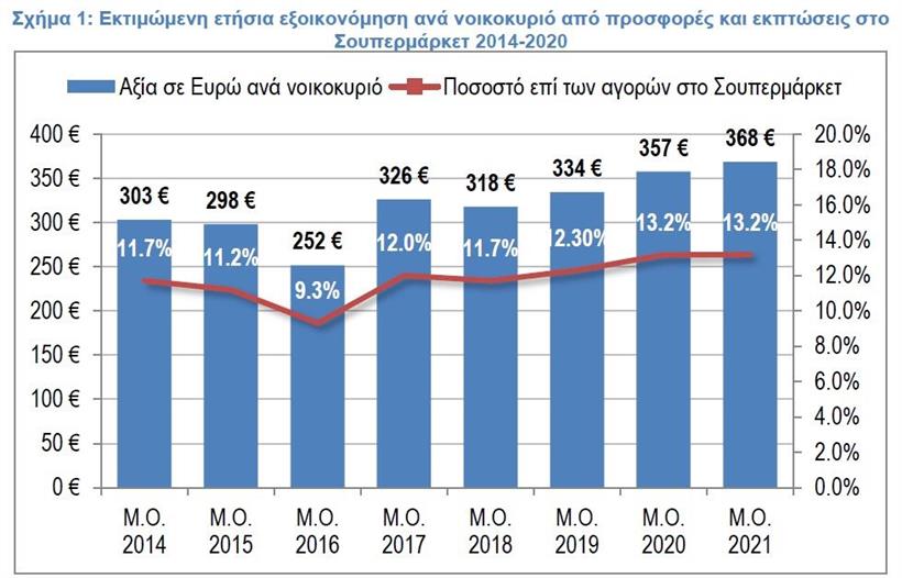 Η μέση εξοικονόμηση που προκύπτει από τη στάθμιση του συνόλου ανέρχεται σε 13%, ποσοστό σταθερό σε σχέση με το προηγούμενο έτος, αλλά αυξημένο σε σχέση με τα προηγούμενα έτη όπως φαίνεται στο σχήμα 1. Πρακτικά, η συνολική αξία αυτών των ενεργειών αντιστοιχεί κατά μέσο όρο σε όφελος περίπου 370 ευρώ ετησίως για το 2021, λόγω και της αύξησης της δαπάνης. Η αξία αυτή είναι αυξανόμενη σε ετησία βάση την τελευταία 5ετία με εξαίρεση το 2016, χρονιά υπολειτουργίας δύο εκ των τότε σημαντικότερων αλυσίδων σουπερμάρκετ της χώρας. Αξίζει να σημειωθεί ότι αυτό το όφελος είναι πολύ σημαντικότερο από το αντίστοιχο όφελος του 2014 εξαιτίας της αύξησης της δαπάνης στων νοικοκυριών σε είδη παντοπωλείου. Συνολικά η μέση εξοικονόμηση ανά νοικοκυριό εκτιμάται σε περίπου 2.500 ευρώ για την τελευταία 8ετία, ενώ η συνολική αξία που έχει δοθεί σε 8 χρόνια ξεπερνά τα 10 δισεκατομμύρια ευρώ.