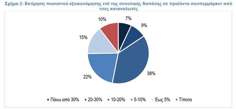 Όπως φαίνεται στο σχήμα 2, η πλειοψηφία του κοινού, 5 στους 10, εξοικονομεί τουλάχιστον 10% της αξίας των αγορών τους, ενώ μόλις 1 στους 10 δηλώνει ότι δεν εξοικονομεί τίποτα, ενώ 2 στους 3 δηλώνουν ότι εξοικονομούν τουλάχιστον 5% από τη συνολική αξία των αγορών τους. Τα ποσοστά αυτά είναι ιδιαίτερα υψηλά και δείχνουν πόσο σημαντικό είναι το όφελος που αποκομίζει το 85% των καταναλωτών. Τα ποσοστά αυτά είναι άλλωστε υψηλότερα του επιπέδου των ανατιμήσεων που καταγράφονται τους τελευταίους μήνες και δείχνουν ότι οι καταναλωτές έχουν τη δυνατότητα με έξυπνες αγορές να εξισορροπήσουν αυτό το επιπλέον κόστος.