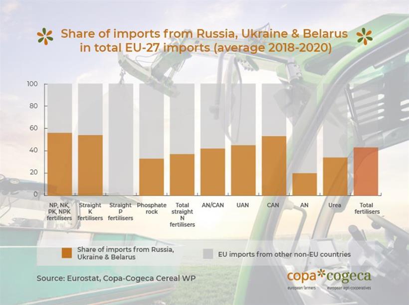 Από τη ρωσική εισβολή στις 24 Φεβρουαρίου, οι αγορές λιπασμάτων βιώνουν μια νέα κρίση, με τη μορφή σοκ προσφοράς αυτή τη φορά. Η Ρωσία, η Λευκορωσία και η Ουκρανία έχουν σταματήσει να εξάγουν λιπάσματα. Δεδομένου ότι η ΕΕ εξαρτάται από τις εισαγωγές λιπασμάτων και οι τρεις χώρες μαζί αντιπροσωπεύουν το 43% των εισαγωγών λιπασμάτων μας, οι τιμές έχουν σημειώσει νέο άλμα σε πρωτοφανή επίπεδα, πολύ πάνω από τις ήδη υψηλές τιμές πριν τον πόλεμο. Η τιμή του διαλύματος αζώτου είναι πλέον 370% πάνω από το επίπεδο του Ιανουαρίου 2021. Τα χειρότερα δεν έχουν έρθει ακόμη, καθώς αναμένονται ελλείψεις εφοδιασμού την ερχόμενη σεζόν που ξεκινά τον Μάιο. Η ανεπαρκής λίπανση θα σημαίνει απώλεια απόδοσης για την επερχόμενη συγκομιδή.