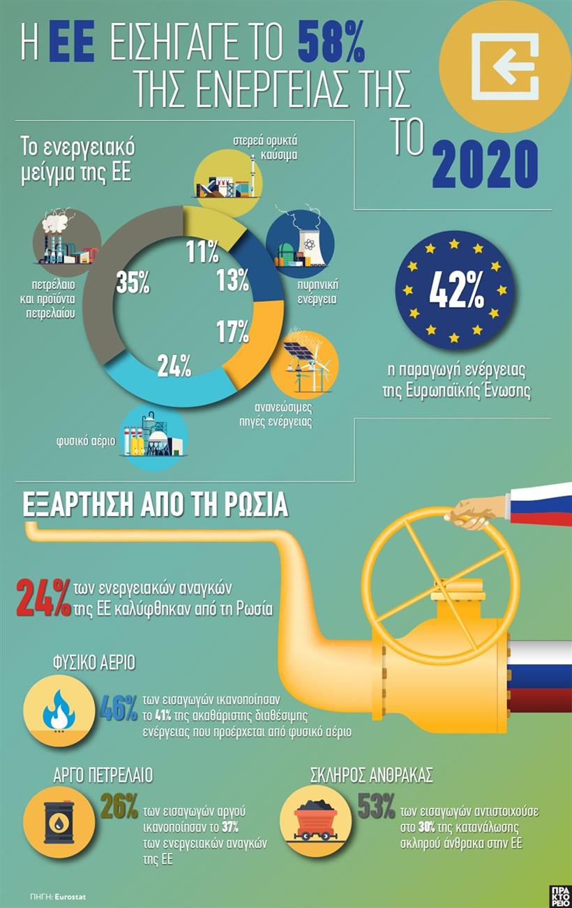Η Ρωσία είναι ο κορυφαίος προμηθευτής της ΕΕ για φυσικό αέριο, πετρέλαιο και άνθρακα, που αποτελούν τα κύρια ενεργειακά προϊόντα του ενεργειακού μείγματος της ΕΕ. Το 2020, οι εισαγωγές από αυτήν την προέλευση ικανοποίησαν το 24% των ενεργειακών αναγκών της ΕΕ.