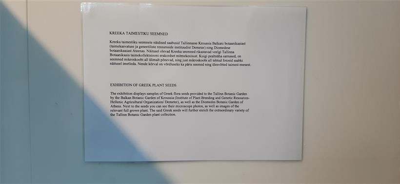 Προκειμένου να προβληθεί έτι περαιτέρω η ελληνική συνεισφορά, με επιμέλεια της Πρεσβείας, προεξέχοντος του Εξοχοτάτου Πρέσβη κ. Ε. Αποστολάκη, διοργανώθηκε έκθεση δειγμάτων καθώς και φωτογραφιών, μέρους των σπόρων που απεστάλλησαν με κατάλληλη αναφορά στον Βαλκανικό Βοτανικό Κήπο Κρουσσίων. Oι επισκέπτες θα έχουν την ευκαιρία να θαυμάσουν την εν λόγω έκθεση καθ’ όλη τη διάρκεια του ελληνικού μήνα στο κεντρικό κτίριο του Βοτανικού Κήπου του Ταλλίν. Η Ελληνική Πρεσβεία μερίμνησε ώστε η συνεισφορά του Βαλκανικού Βοτανικού Κήπου Κρουσσίων να προβληθεί καταλλήλως με δελτία τύπου σε αγγλικά , εσθονικά και ρωσικά.