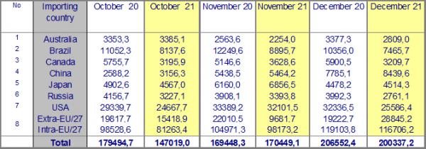 Τους πρώτους τρεις μήνες της καλλιεργητικής περιόδου 2021/22 (Οκτώβριος – Δεκέμβριος 2021), οι εξαγορές εντός της ΕΕ μειώθηκαν κατά 8% και οι εξωκοινοτικές εισαγωγές μειώθηκαν κατά 12% σε σύγκριση με την ίδια περίοδο του προηγούμενου καλλιεργητικού έτους.