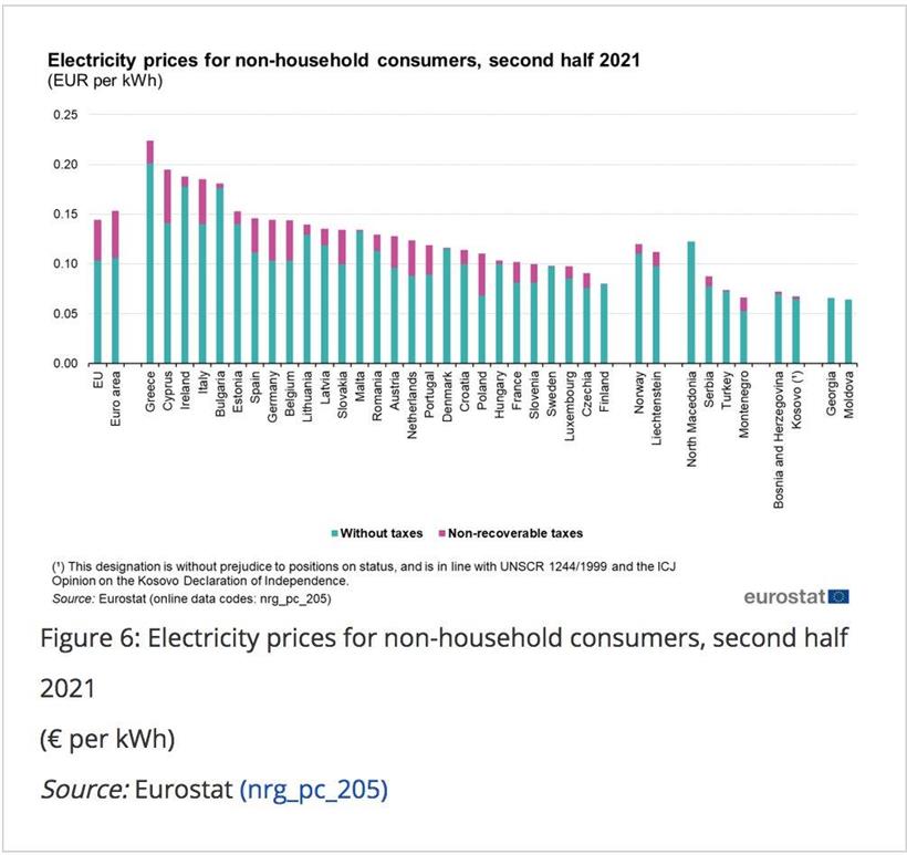 Tα στοιχεία της Eurostat είναι εξόχως διαφωτιστικά: οι ελληνικές επιχειρήσεις (αφορά λιανικά τιμολόγια μη οικιακών καταναλωτών) ήρθαν αντιμέτωπες με τη δεύτερη μεγαλύτερη αύξηση στη λιανική τιμή, το β’ εξάμηνο του 2021, με τη Βουλγαρία να έχει τα πρωτεία. Σε απόλυτους αριθμούς… κόστους ηλεκτρικής ενέργειας, όμως, είχαν το θλιβερό προνόμιο να βρίσκονται στην πρώτη θέση σ’ όλη την Ευρώπη.