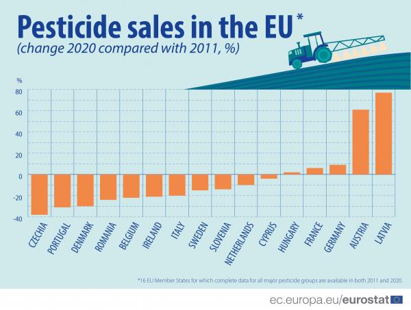 Μεταξύ 2011 και 2020, 11 από τα 16 κράτη μέλη με διαθέσιμα στοιχεία, κατέγραψαν χαμηλότερες πωλήσεις φυτοφαρμάκων. Η μεγαλύτερη πτώση καταγράφηκε στην Τσεχία (-38%). Η Πορτογαλία, η Δανία, η Ρουμανία, το Βέλγιο και η Ιρλανδία ανέφεραν επίσης πωλήσεις που ήταν τουλάχιστον 20% χαμηλότερες το 2020 σε σχέση με το 2011. Αντίθετα, η Αυστρία (+61%) και η Λετονία (+77%) ανέφεραν σημαντικά υψηλότερες πωλήσεις φυτοφαρμάκων το 2020 από το 2011.