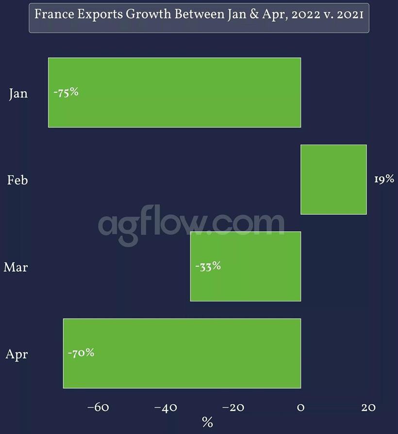 Οι γαλλικές εξαγωγές σιταριού αντιπροσωπεύουν σημαντικό μέρος των γεωργικών εξαγωγών της ΕΕ. Στις αρχές του 2022, οι εξαγωγές για τα βασικά προϊόντα μειώθηκαν σημαντικά μεταξύ Ιανουαρίου και Απριλίου σε σύγκριση με το προηγούμενο έτος.