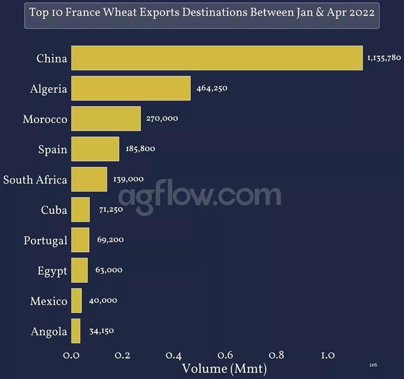 Παρά τις αυξανόμενες εξαγωγές προς την Κίνα – χάρη στις πιο ανταγωνιστικές τιμές από τις ΗΠΑ, την έλλειψη διαθεσιμότητας της εξαιρετικά απαιτούμενης αυστραλιανής καλλιέργειας και την απώλεια από την Κίνα στην προσφορά σίτου της Ουκρανίας λόγω της σύγκρουσης από τα τέλη Φεβρουαρίου 2022 – Οι εξαγωγές σιταριού στη Γαλλία μειώθηκαν μαζικά στη Βόρεια Αφρική, την κύρια αγορά της.