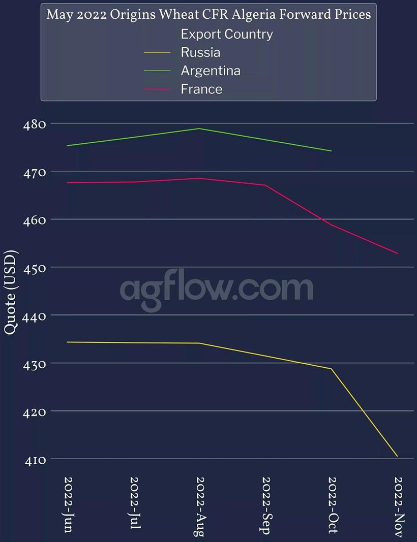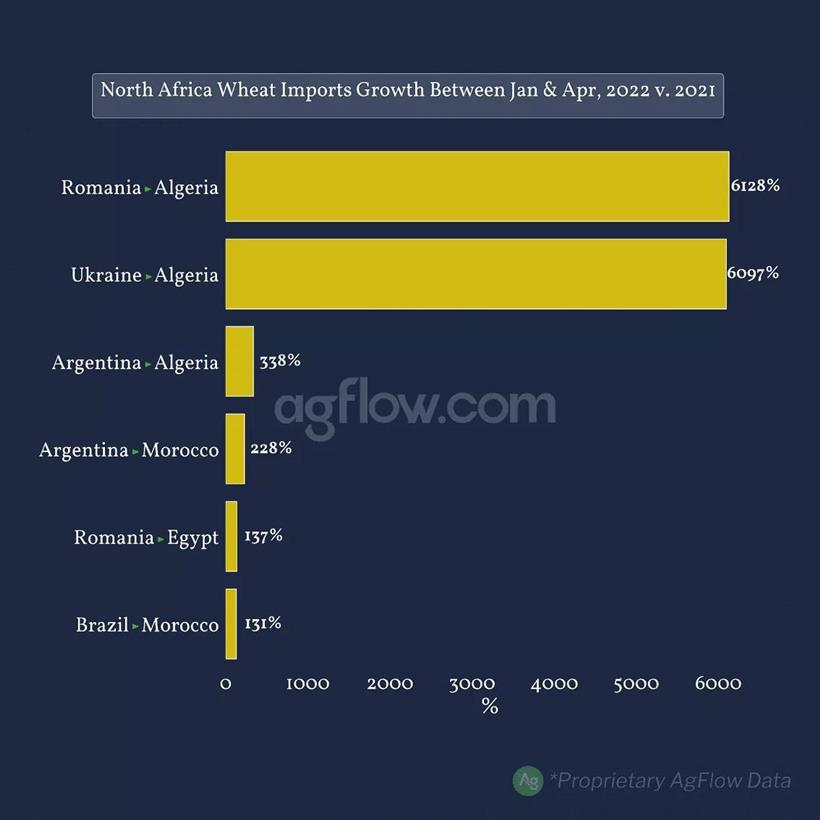 Το γαλλικό σιτάριαντιμετωπίζει συνήθως ανταγωνισμό από τη Ρωσία και την Ουκρανία στη Βόρεια Αφρική. Ωστόσο, το 2022, λόγω των αυξανόμενων τιμών, η ζήτηση σίτου στην Ουκρανία αυξήθηκε γρήγορα ως φθηνό και υψηλής ποιότητας προϊόν. Μετά τη σύγκρουση στην Ουκρανία, οι τιμές αυξήθηκαν ακόμη περισσότερο και η Γαλλία έγινε πολύ λιγότερο ανταγωνιστική. Ως εκ τούτου, η Αλγερία, το Μαρόκο και η Αίγυπτος αναζήτησαν πιο προσιτά προϊόντα σιταριού αλλού. Πράγματι, μεταξύ Ιανουαρίου και 22 Απριλίου, η Ρουμανία έγινε ακόμη πιο ελκυστική, αυξάνοντας τις εξαγωγές προς την Αλγερία κατά 350 kmt και 862 kmt στην Αίγυπτο. Η Νότια Αμερική έγινε επίσης σημαντική προέλευση, καθώς η Αργεντινή αύξησε τις εξαγωγές στην περιοχή κατά 1,8 εκατ. τόνους την ίδια περίοδο, το 56% των οποίων προοριζόταν για την Αλγερία.