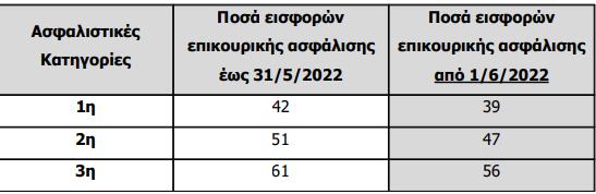 γ) Μη μισθωτούς ασφαλισμένους (Υγειονομικούς - Αυτοαπασχολούμενους και ασφαλισμένους του π. ΟΓΑ) που υπάγονται προαιρετικά στην ασφάλιση του Κλάδου Επικουρικής από 1/1/2021 σύμφωνα με τις διατάξεις του άρθρου 41 του ν. 4670/2020, μειώνονται και ισχύουν από 01.06.2022, ανά ασφαλιστική κατηγορία, ως εξής :