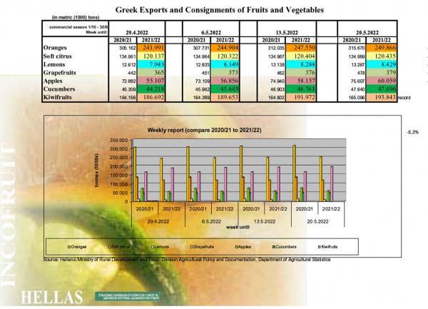 Αντίστοιχα οι εξαγωγές ντομάτας την περίοδο 1/1-19/5/2022 παρουσιάζουν μια μείωση κατά 27,7% έναντι της αντίστοιχης περσινής περιόδου. Από το σύνολο των ποσοτήτων προς εξαγωγή, το 73,4% εξήχθησαν προς Βουλγαρία και το 9,7% προς Ρουμανία.