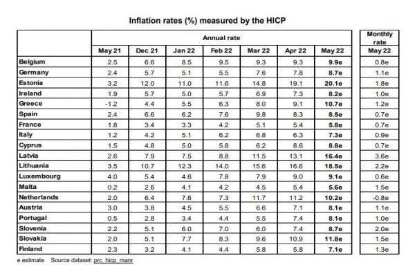 Εξετάζοντας τους βασικούς παράγοντες του πληθωρισμού στη ζώνη του ευρώ, η ενέργεια αναμένεται να έχει τον υψηλότερο ετήσιο ρυθμό τον Μάιο (39,2%, έναντι 37,5% τον Απρίλιο), ακολουθούμενη από τα τρόφιμα, το αλκοόλ και τον καπνό (7,5%, έναντι 6,3% τον Απρίλιο ), τα μη ενεργειακά βιομηχανικά αγαθά (4,2%, έναντι 3,8% τον Απρίλιο) και τις υπηρεσίες (3,5%, έναντι 3,3% τον Απρίλιο).