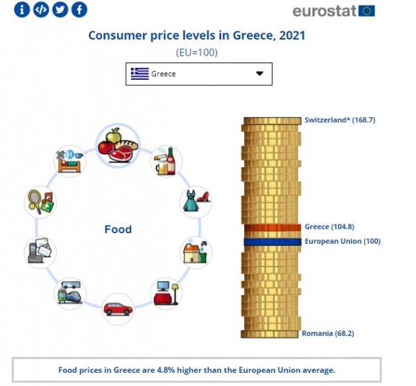 Σύμφωνα με στοιχεία της Eurostat, οι τιμές των τροφίμων στην Ελλάδα το 2021 ήταν κατά 4,8% ακριβότερες από την Ε.Ε. Στις υψηλότερες τιμές έχουν συμβάλει προφανώς και οι υψηλότεροι συντελεστές ΦΠΑ που ισχύουν στην Ελλάδα, με το ΙΕΛΚΑ να υπολογίζει ότι η χώρα μας βρίσκεται στην έκτη θέση.