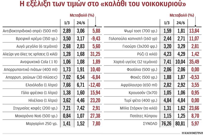 Αποκαλυπτικά για την κατακόρυφη αύξηση των τιμών τους τέσσερις τελευταίους μήνες είναι τα στοιχεία από την πλατφόρμα – παρατηρητήριο τιμών e-Καταναλωτής του υπουργείου Ανάπτυξης και Επενδύσεων. Η αξία ενός τυπικού «καλαθιού» έχει αυξηθεί κατά περίπου 6% μέσα σε αυτό το διάστημα, με τις μεγαλύτερες ανατιμήσεις να καταγράφονται στα χαρτιά υγείας (35,49%), στο αλεύρι (31,25%), στα μακαρόνια (27,38%), στο ηλιέλαιο (23,20%). Πολύ σημαντικές, διότι επιβαρύνουν τον οικογενειακό προϋπολογισμό σχεδόν σε καθημερινό επίπεδο, είναι οι ανατιμήσεις στο γάλα και εν γένει στα γαλακτοκομικά, στα αυγά, στα αλλαντικά, σε λαχανικά και φρούτα, καθώς βεβαίως και στο ψωμί (13,84% αύξηση στο ψωμί του τοστ, ενώ πολύ μεγάλες είναι οι ανατιμήσεις και στο φρέσκο ψωμί). Σημειώνεται ότι τα στοιχεία αφορούν τις μέσες τιμές για συγκεκριμένα επώνυμα προϊόντα.