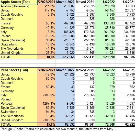 Από την άλλη πλευρά, τα αποθέματα αχλαδιών διαμορφώθηκαν σε 72.868 τόνους την 1η Ιουνίου 2022, 15,8% πάνω από τον όγκο του 2021. Η αύξηση από το 2021 οφείλεται σχεδόν αποκλειστικά στα αχλάδια Rocha της Πορτογαλίας, τα οποία αυξήθηκαν κατά 15.329 τόνους.